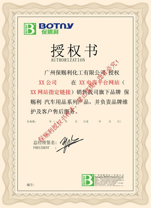 1、請各位網(wǎng)絡(luò)買家在購買廣州保賜利化工有限公司旗下系列品牌之系列產(chǎn)品時,選擇正規(guī)、正品網(wǎng)店進行購買,我司已對銷售我司產(chǎn)品網(wǎng)絡(luò)銷售商予以審查,并對合格網(wǎng)銷商簽發(fā)專屬網(wǎng)絡(luò)銷售運營授權(quán)書,為維護廣大網(wǎng)絡(luò)買家權(quán)益,我司在本平臺予以公布授權(quán)書標準版本,以供大家購買保賜利產(chǎn)品時鑒別正品賣家。(授權(quán)書標準版本請見本頁下示圖片)