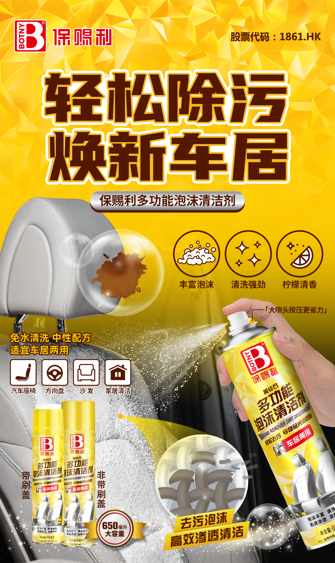 保賜利多功能泡沫清潔劑(黃鉆石)車家清潔好幫手!免水清洗,一噴一抹,輕松去除污垢!